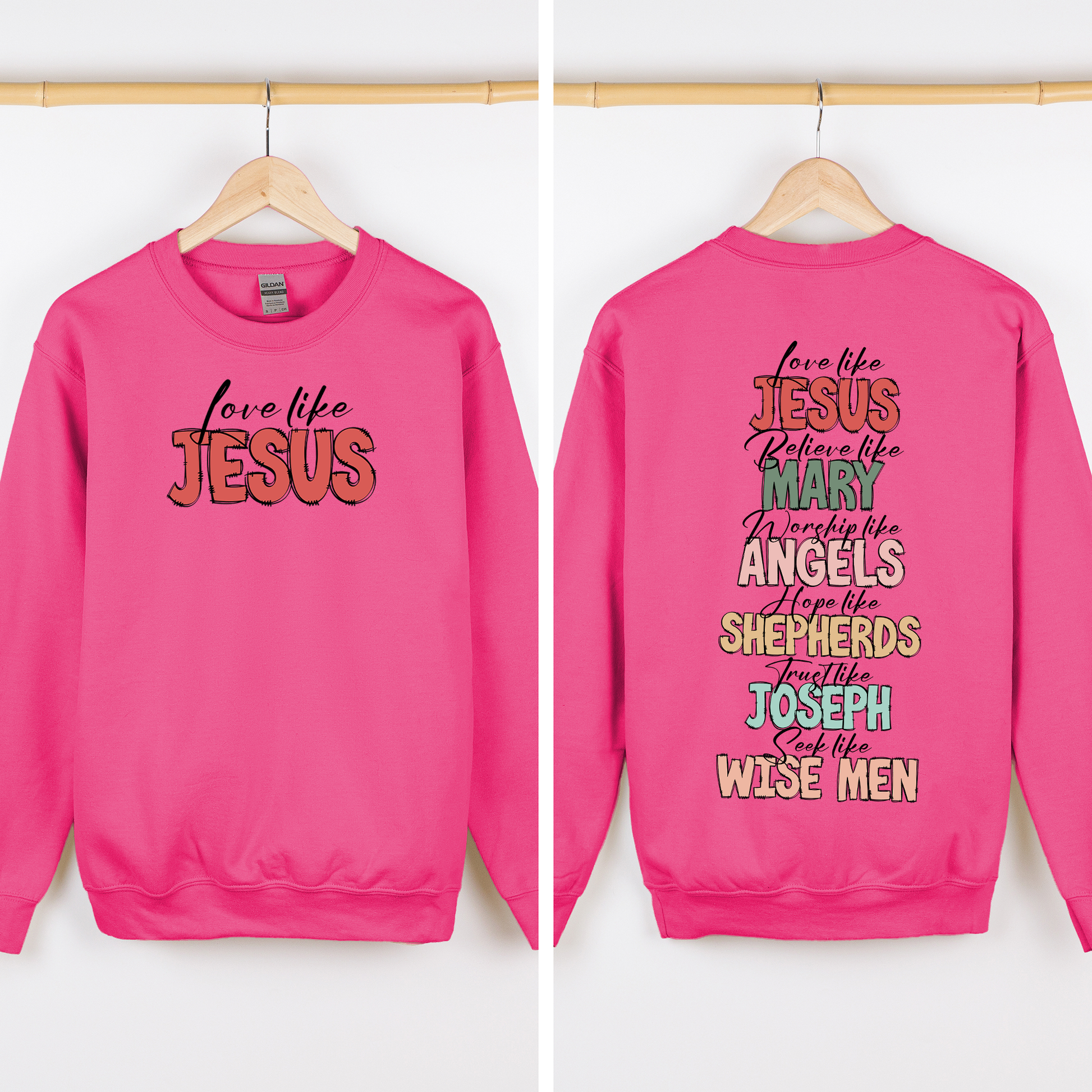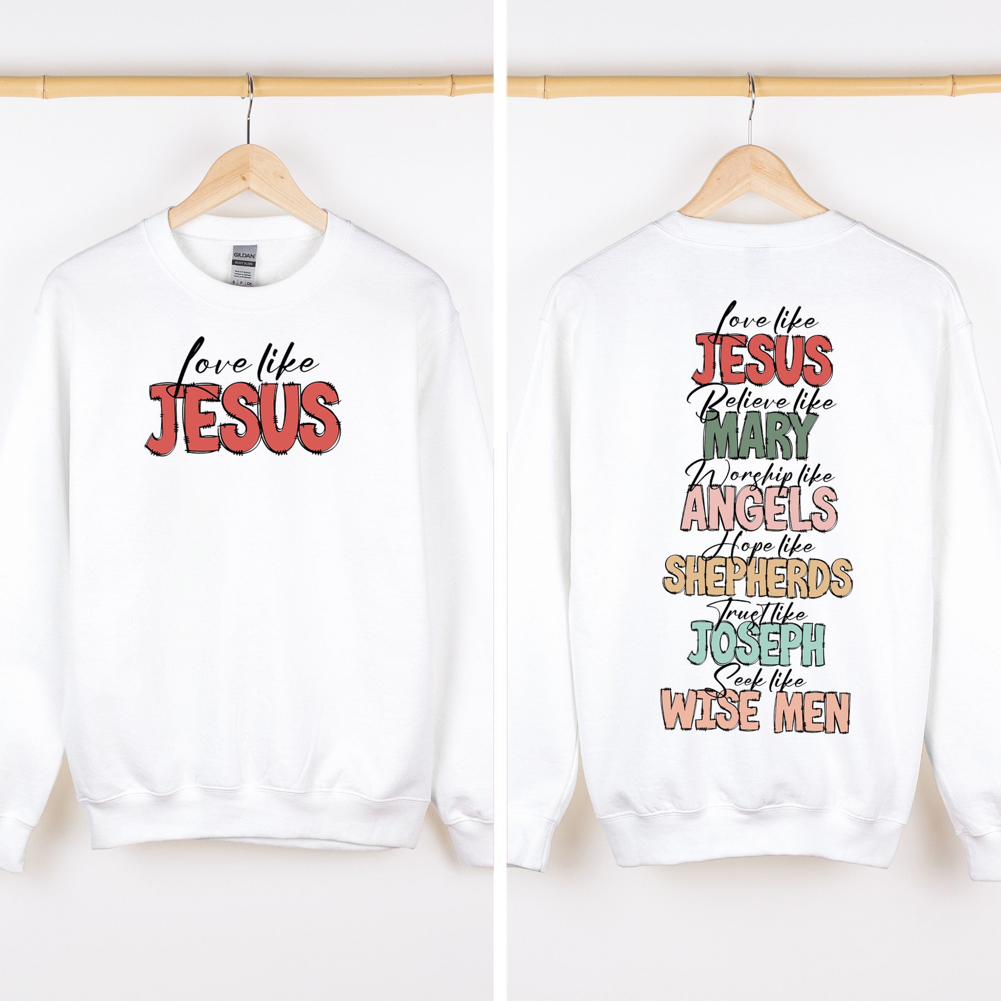 Cozy sweatshirt featuring “Love Like Jesus” design on front and back
